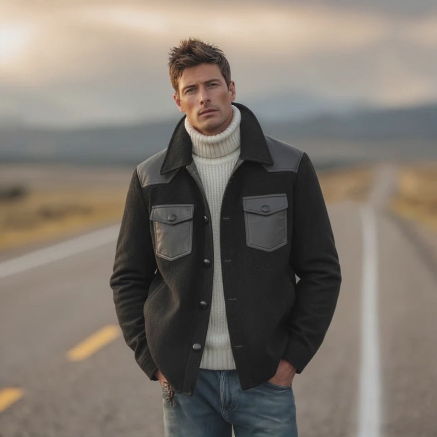 Men's Vintage Twill Faux Wool Patchwork PU Leather Jacket MTA2312J7U