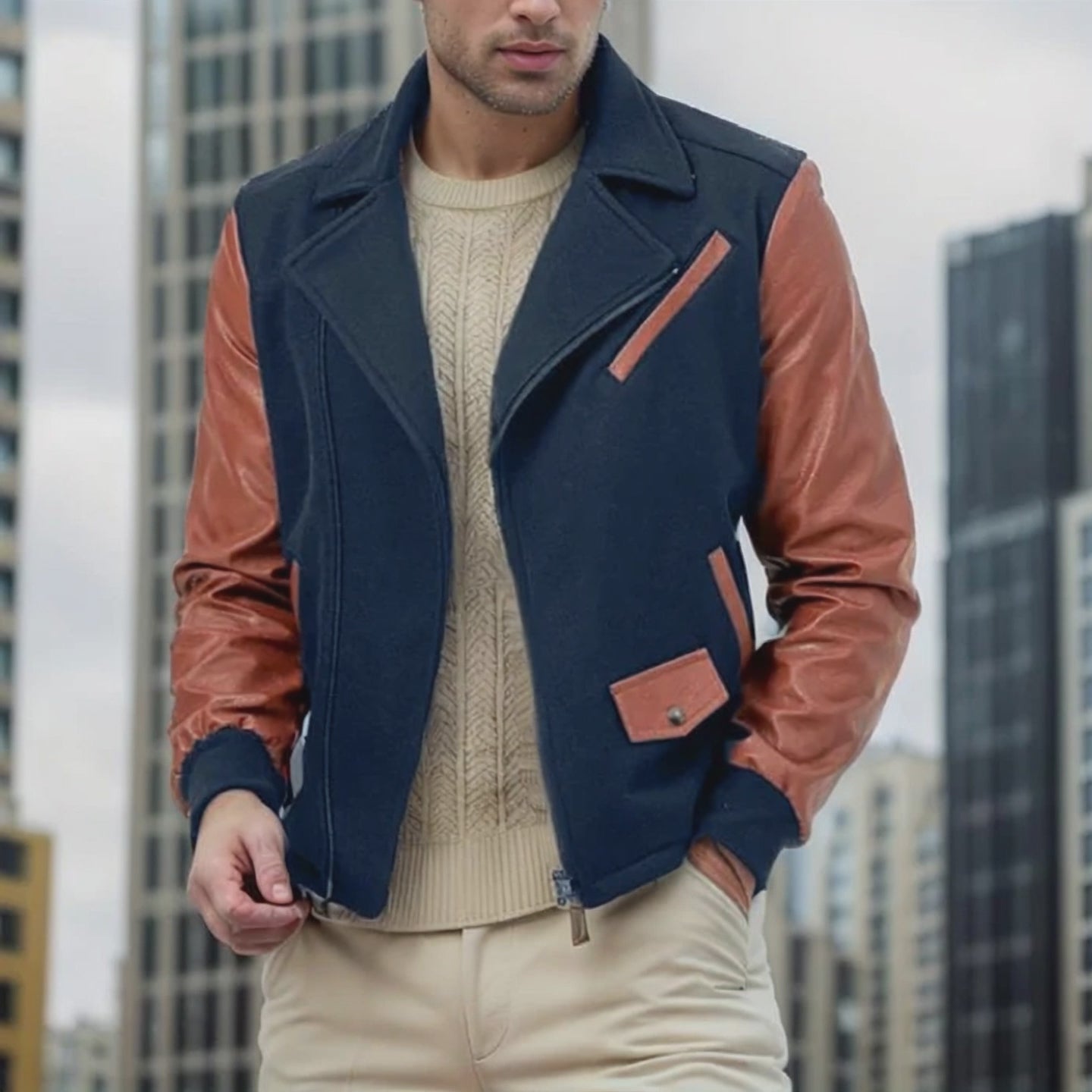 Men's Wool Leather Panel Casual Baseball Jacket 08101399M