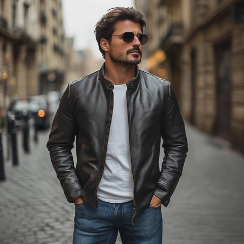 Men's Elegant Stand Collar Slim Zipper Leather Jacket 56943716M