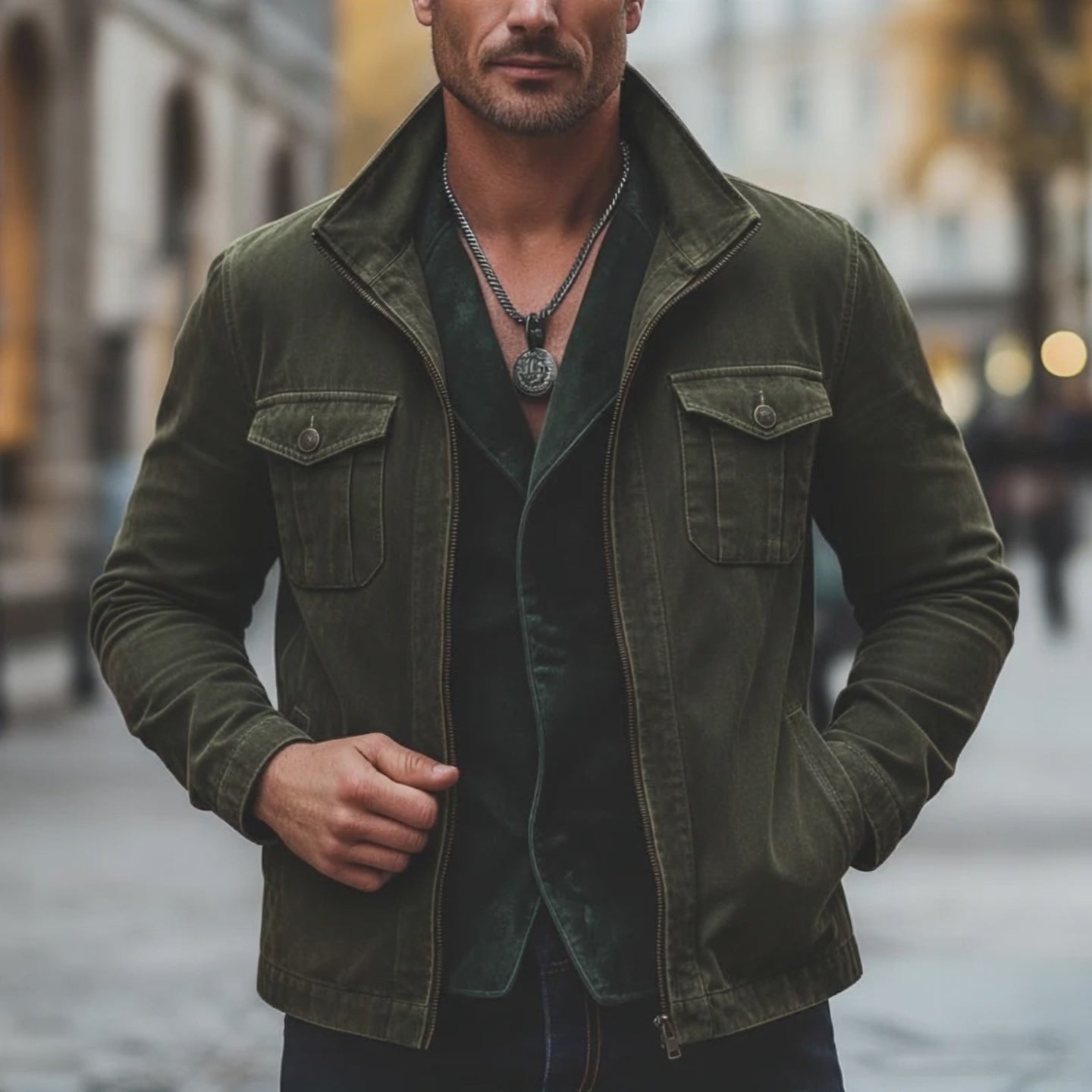 Men's Urban Army Green Faux Suede Stand Collar Zip-Up Jacket MTA2383L9U