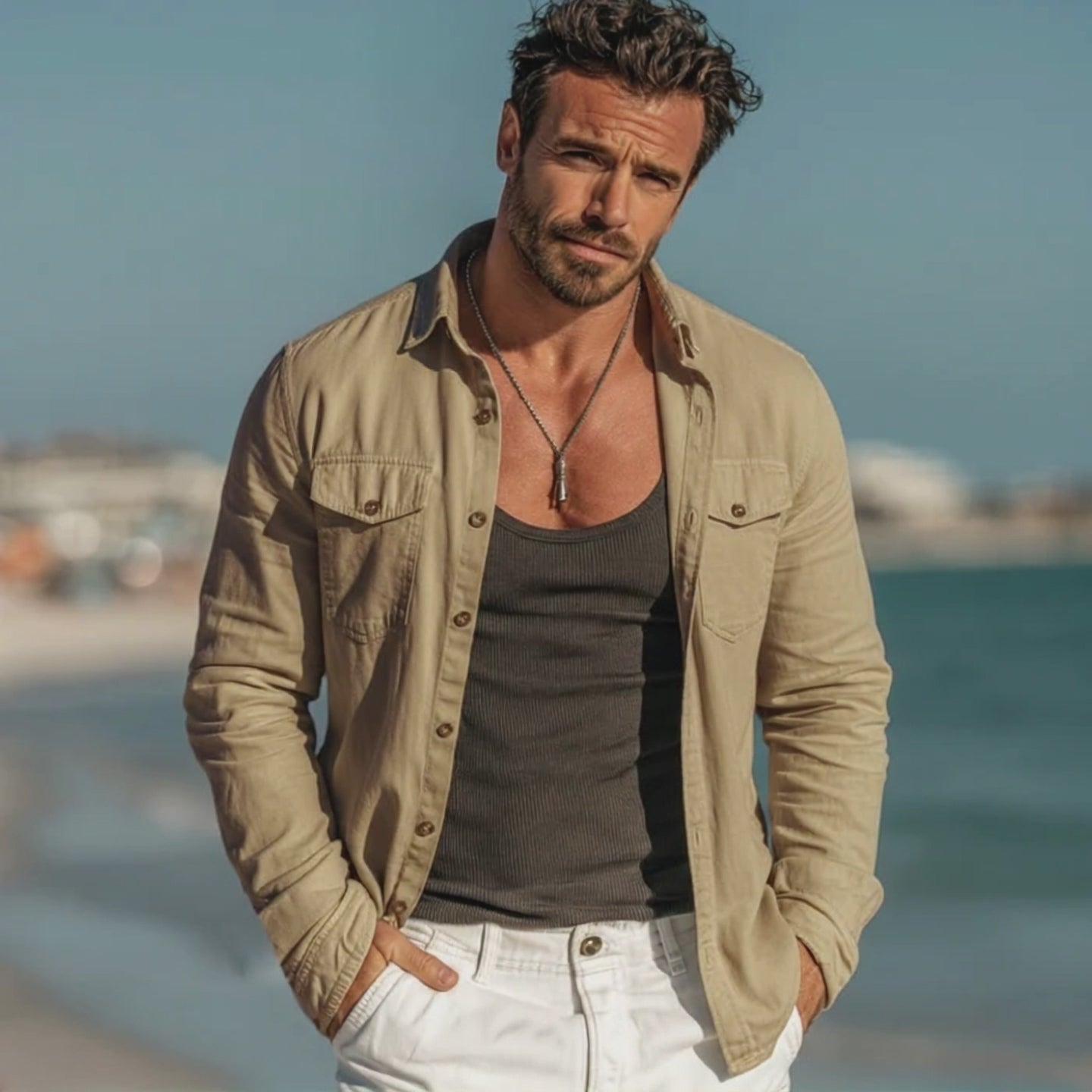 Men's Classic Beige Stand-collar Button-up Jacket MTZ2355A9U