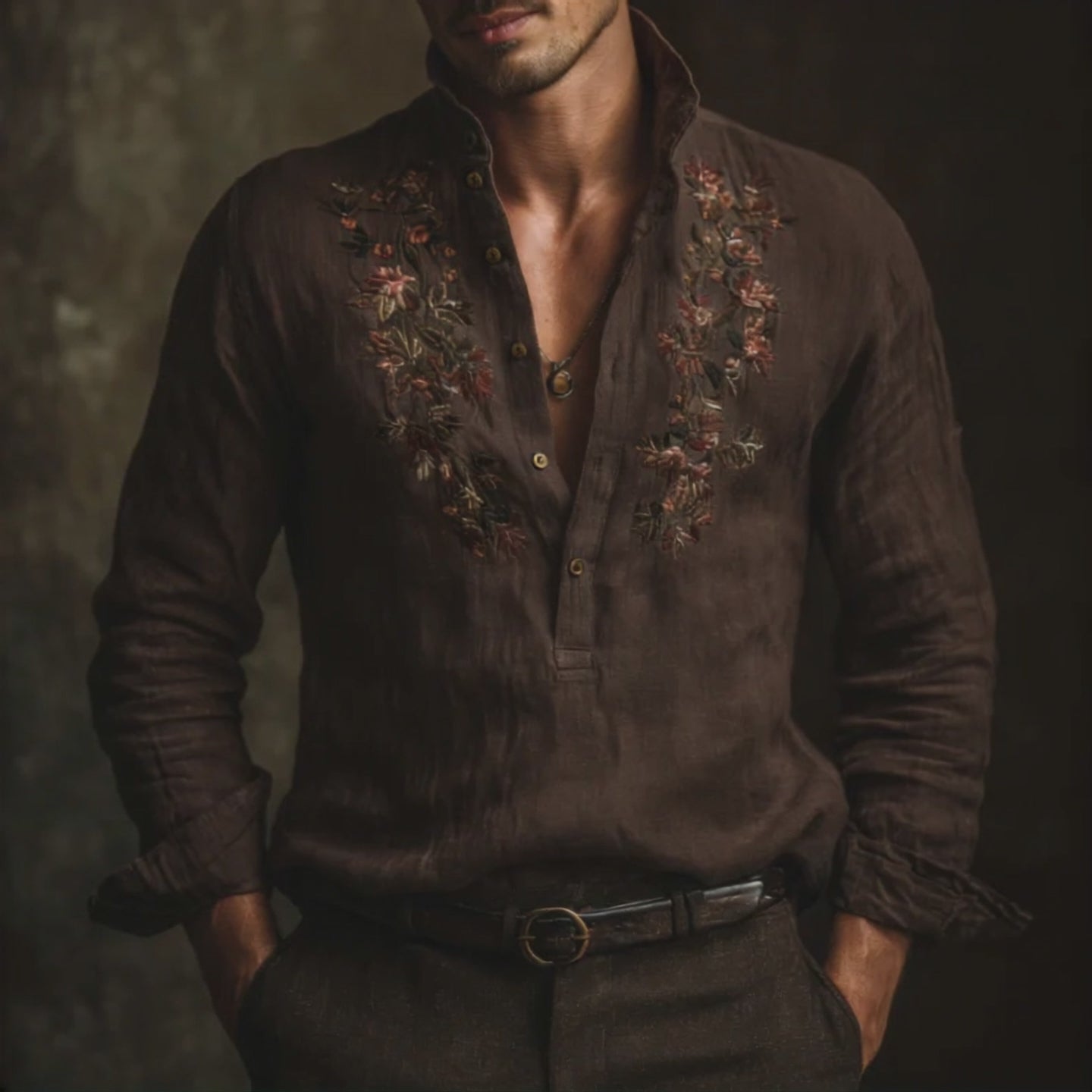 【24-hour shipping out】Men's Vintage Casual Embroidered Cotton and Linen Henley Collar Long Sleeve Shirt 39916816TO