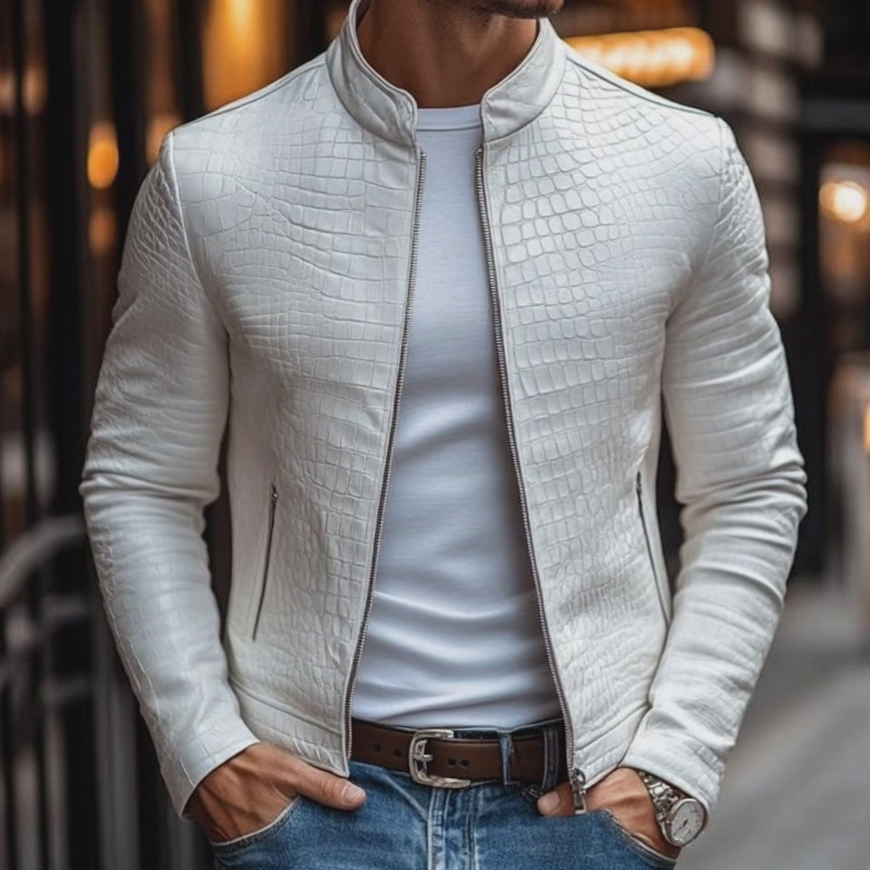 Modische Slim Fit Lederjacke für Herren mit Steinmuster, Stehkragen, Reißverschluss 45773252M