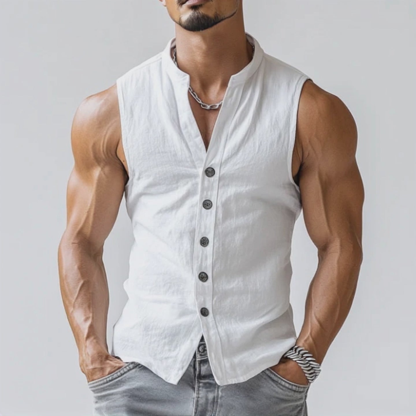 The Men's Casual Comfort Cotton Stand Collar Single Breasted Sleeveless Shirt is a must-have for warm-weather dressing. With its premium cotton construction, modern stand collar, and versatile design, this shirt offers style and comfort for any casual occasion. Elevate your summer wardrobe with this essential piece, and enjoy the perfect blend of fashion and functionality all season long!