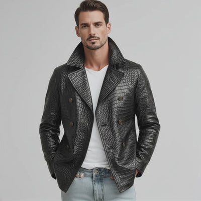 The MEN'S CLASSIC CASUAL LAPEL DOUBLE-BREASTED CROCODILE LEATHER TEXTURE PU LEATHER JACKET delivers a refined, statement outer layer that blends a premium embossed texture with a timeless double-breasted silhouette. Its tailored fit, practical pockets, and durable construction make it a versatile choice for elevating everyday outfits with a bold, polished edge.