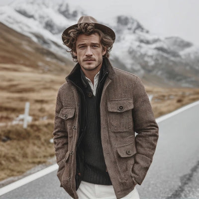 Men's Classic Casual Stand-up Collar Multi-pocket Faux Herringbone Woolen Jacket MTA1618J9K