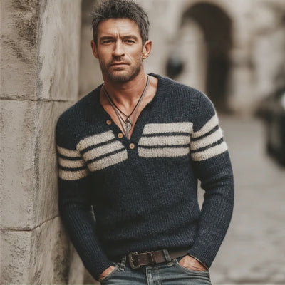 The Men's Classic V-neck Color-blocked Striped Slim-fit Knit Sweater is an exquisite addition to any wardrobe, combining timeless style with contemporary design. Its V-neck design and color-blocked stripes add a modern flair to this classic knitwear piece, making it both versatile and stylish.