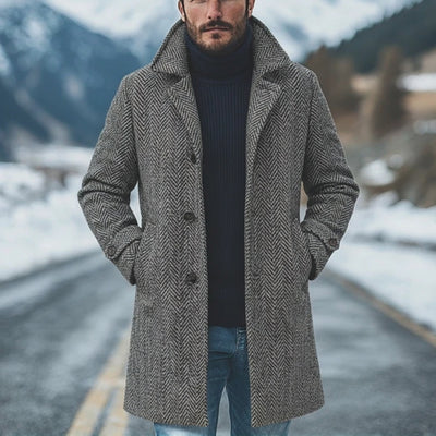 The Men's Herringbone Blend Lapel Mid-length Coat is a stylish addition to any wardrobe, offering a blend of classic aesthetics and modern versatility. Its premium fabric and polished design make it a standout choice suitable for various settings.