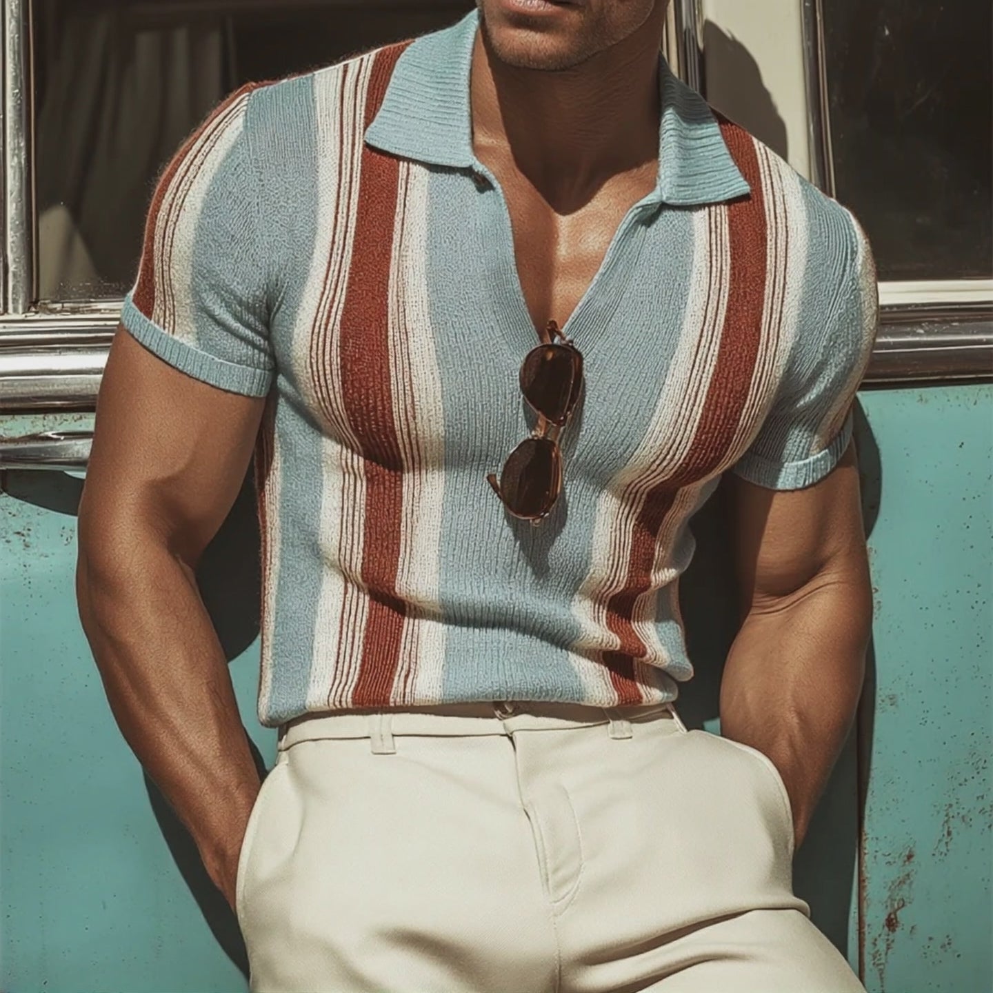 Men's Retro Casual Knit Striped Lapel Short-Sleeve T-Shirt