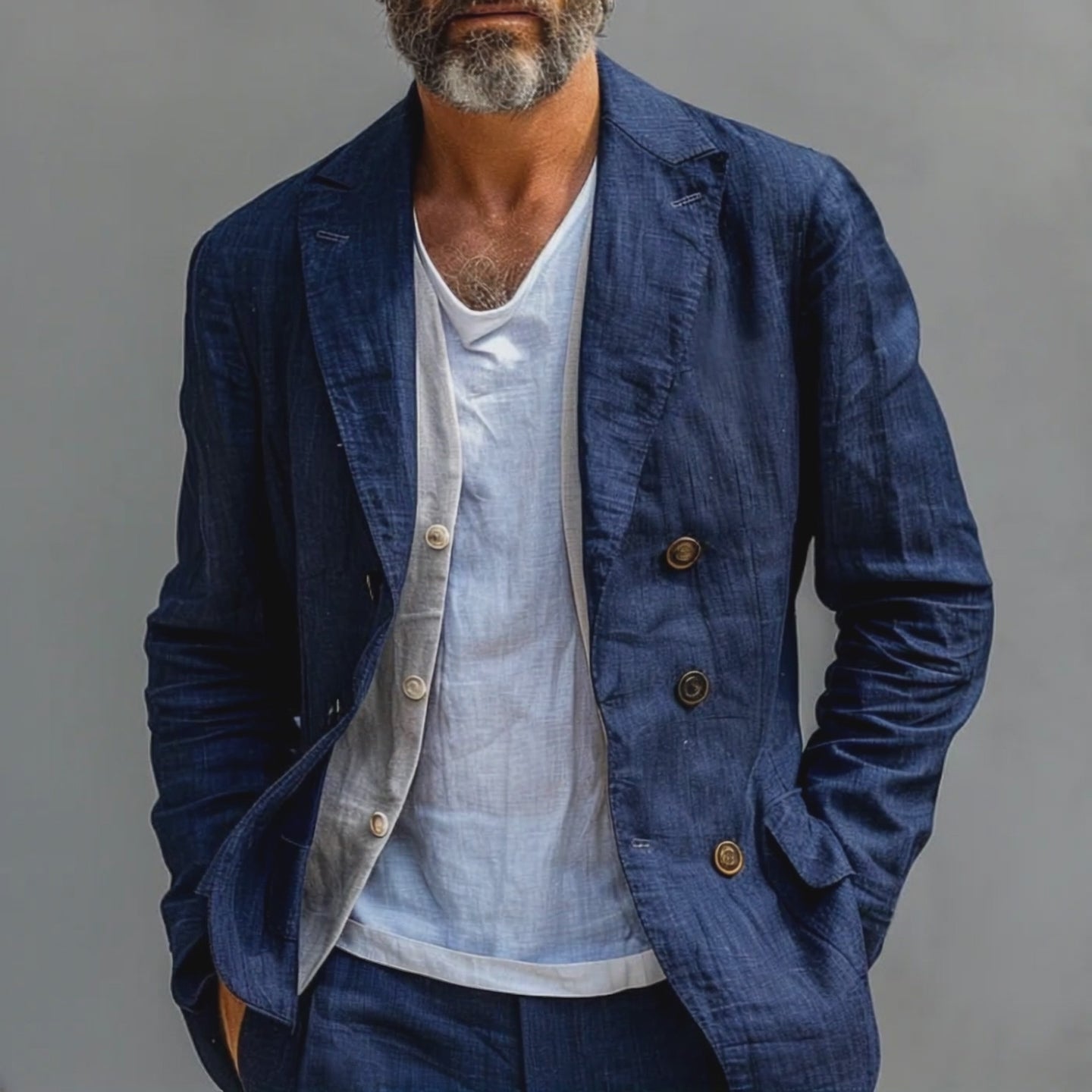 Werten Sie Ihre Garderobe mit unserem zweireihigen Freizeitblazer aus fester Baumwolle und Leinen mit fallendem Revers für Herren auf, der klassische Designelemente mit modernem Komfort für einen raffinierten und mühelosen Look kombiniert.