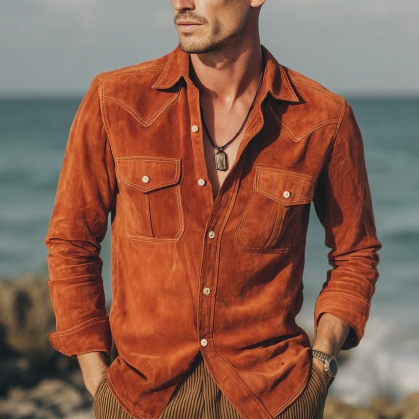 Versatile enough to be worn untucked with casual pants or tucked in for a more polished look. The suede fabric offers a luxurious feel, making it suitable for various occasions from casual outings to semi-formal events.