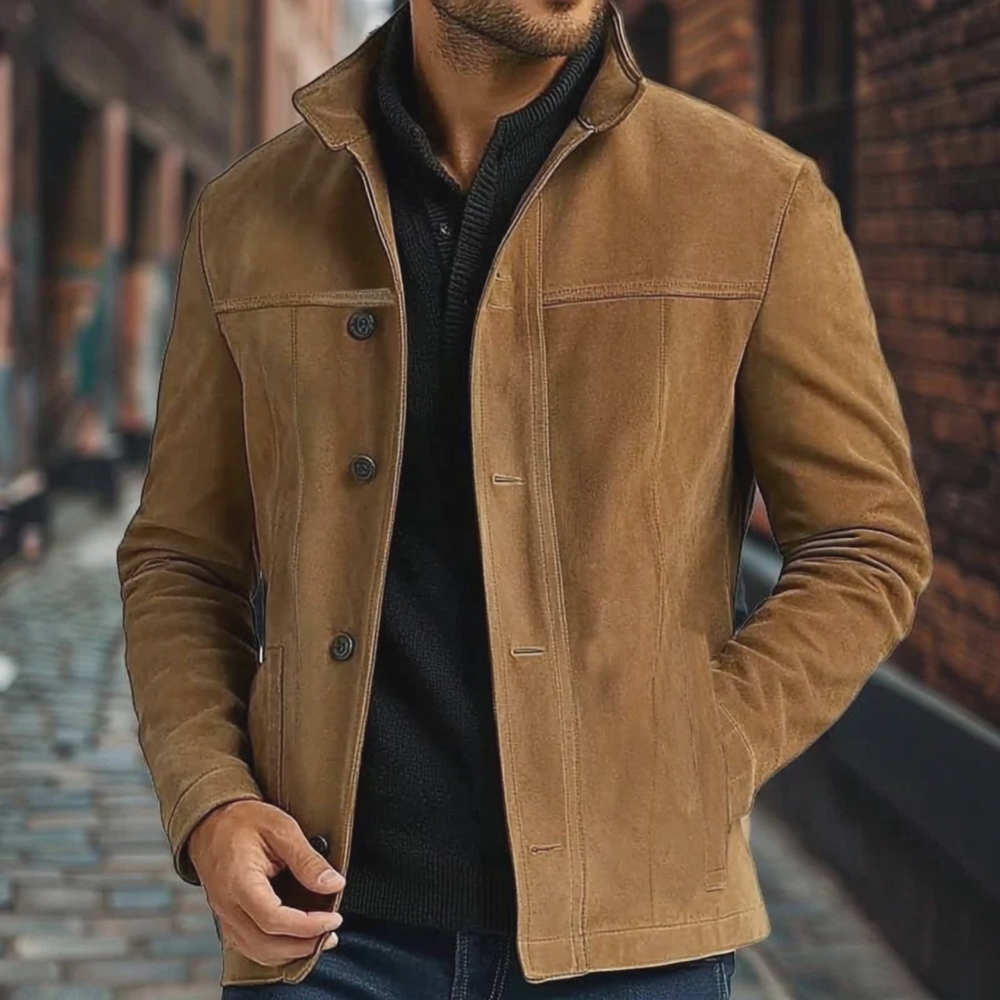 Verleihen Sie Ihrer Garderobe mit der einreihigen Vintage-Wildlederjacke für Herren einen Hauch von Eleganz und setzen Sie überall ein stilvolles Statement!