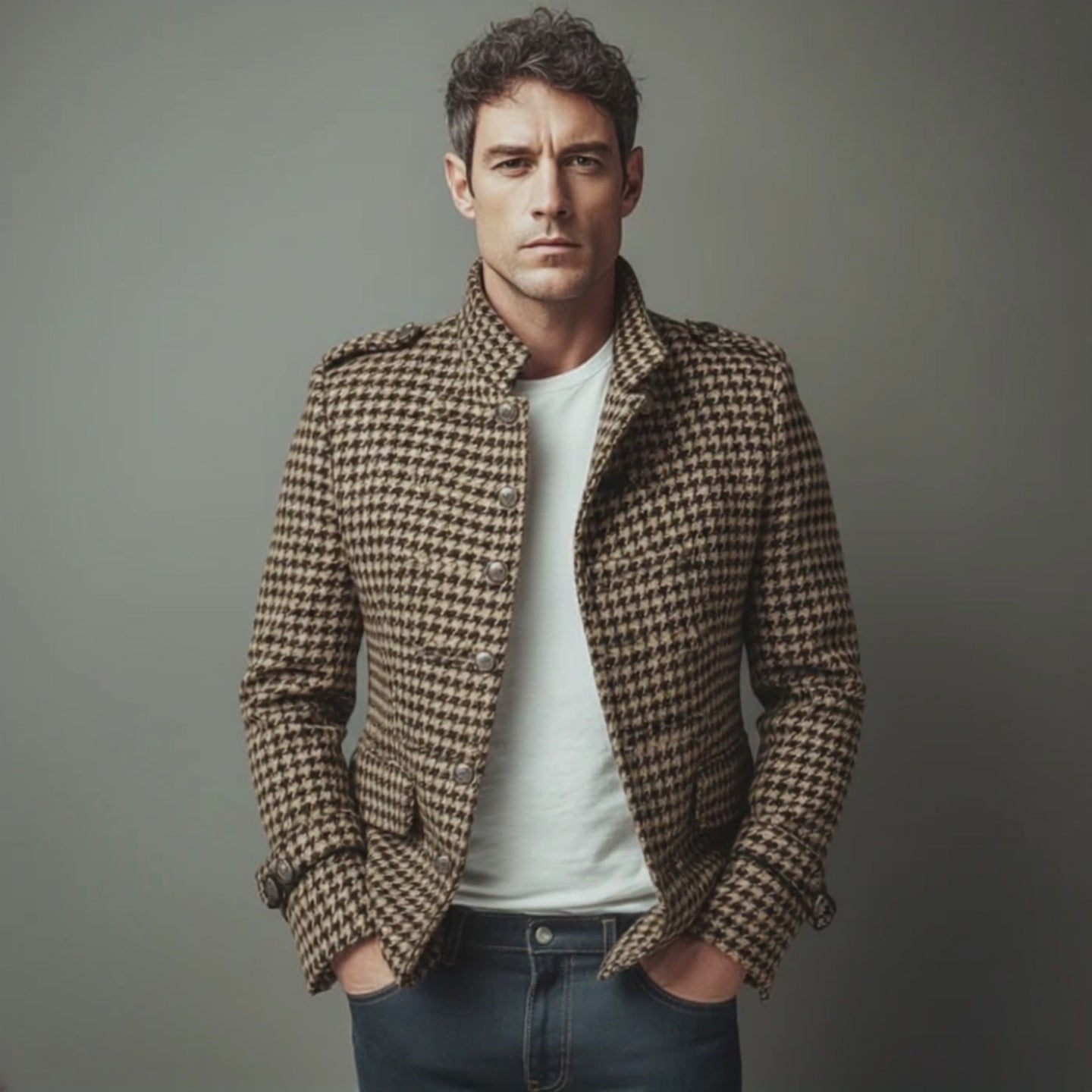 Men's Classic Retro Stand Collar Houndstooth Wool Single-breasted Slim-fit Jacket MTA1726I1K
