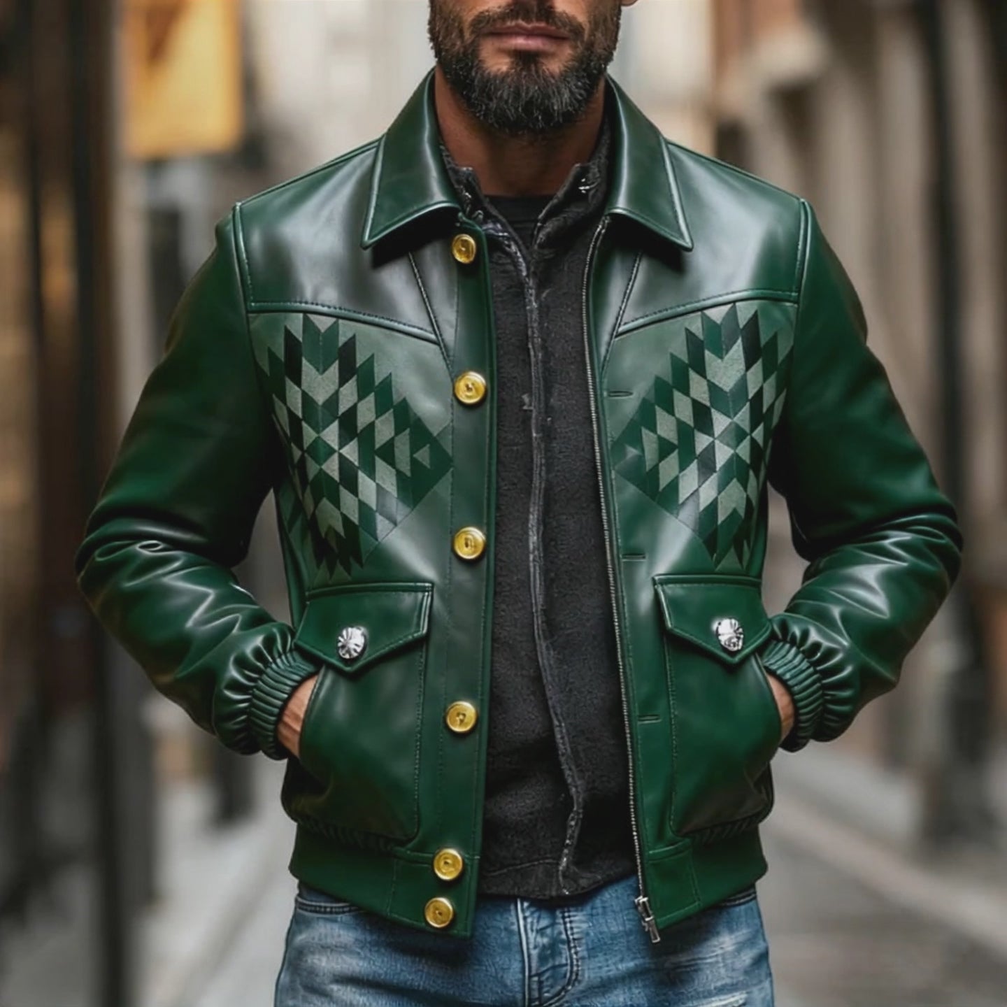 Men's Retro Geometric Print Lapel PU Single Breasted Jacket MTA2023J8X