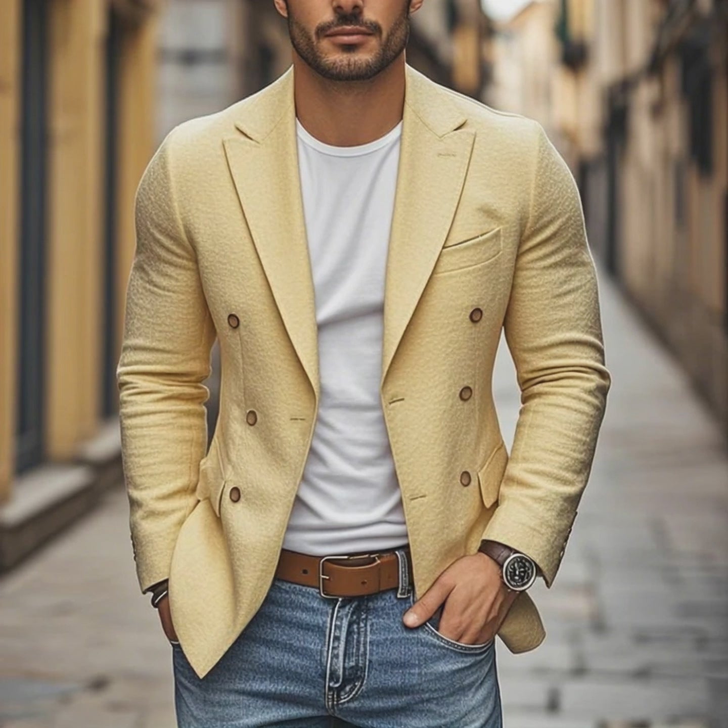 Men's Casual Cotton Linen Peaked Lapel Double-Breasted Slim-Fit Blazer MTA0296D4M