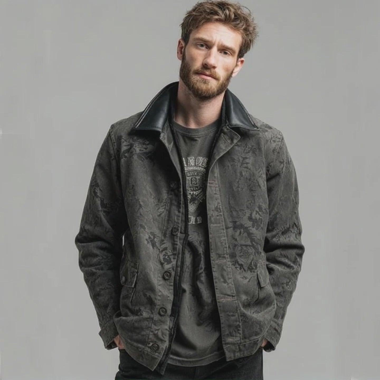 Men's Vintage Dark Print And PU Leather Collar Button Jacket MTA2151J4U