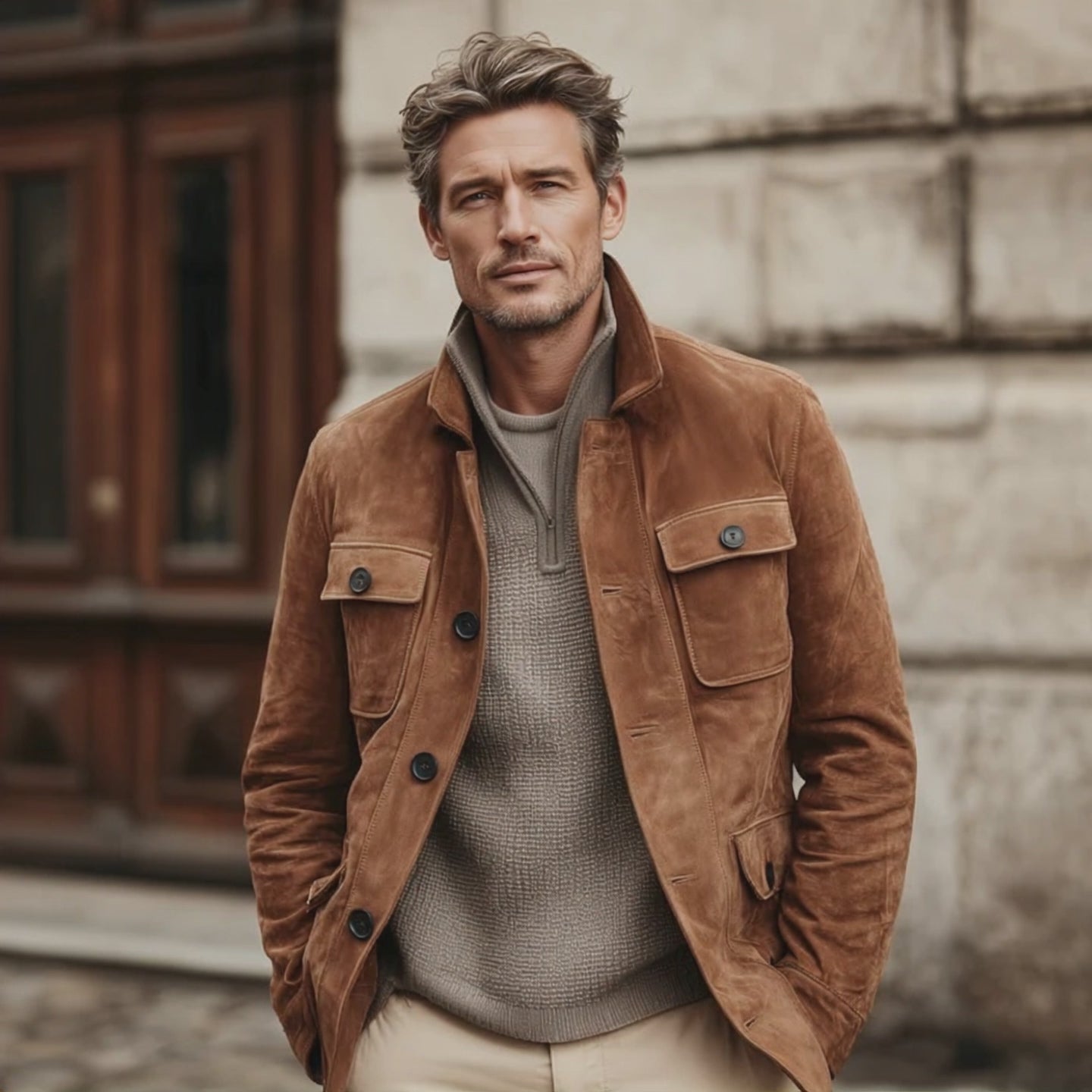Men's Classic Retro Business Stand Collar Faux Suede Multi-Pocket Jacket MTA2176J0K
