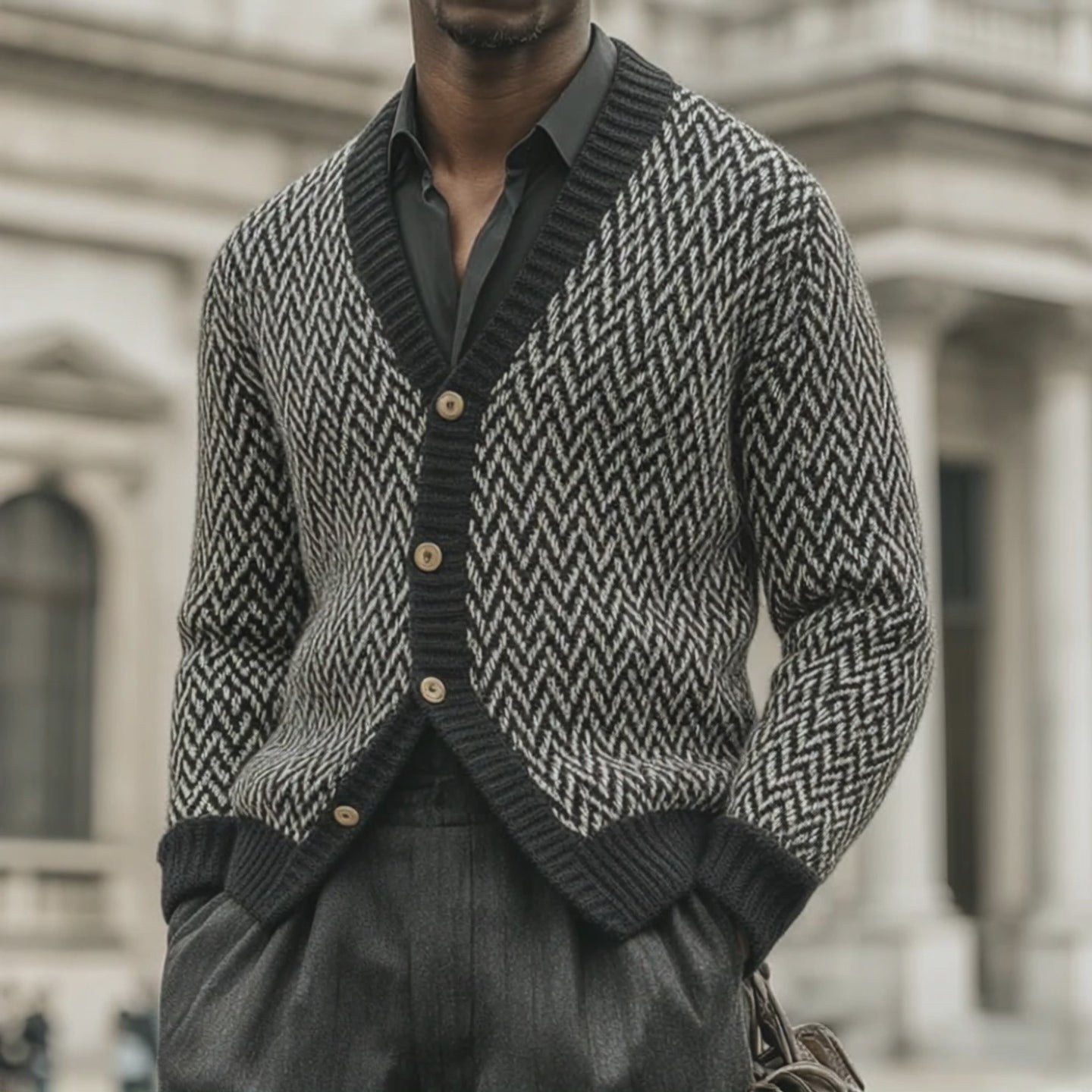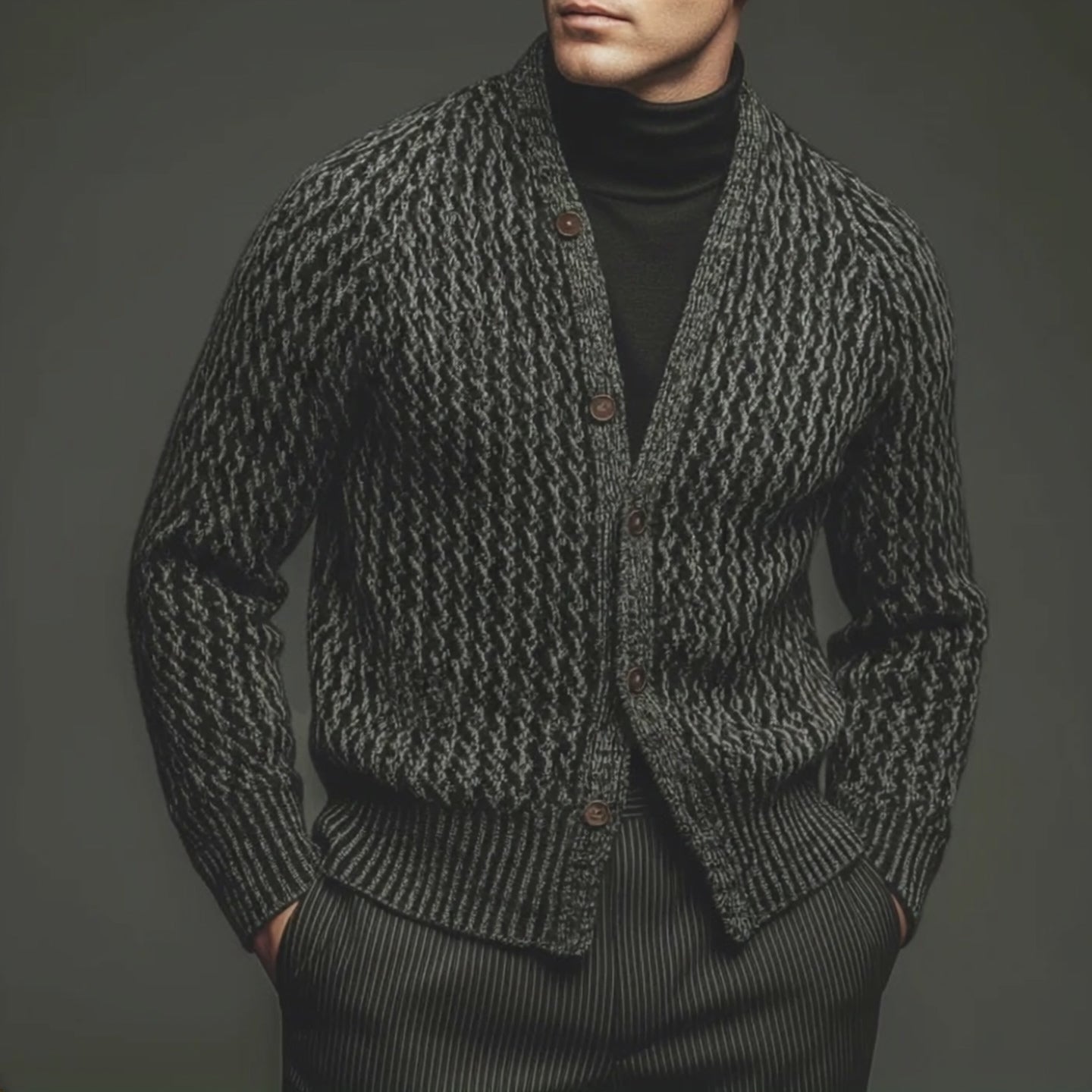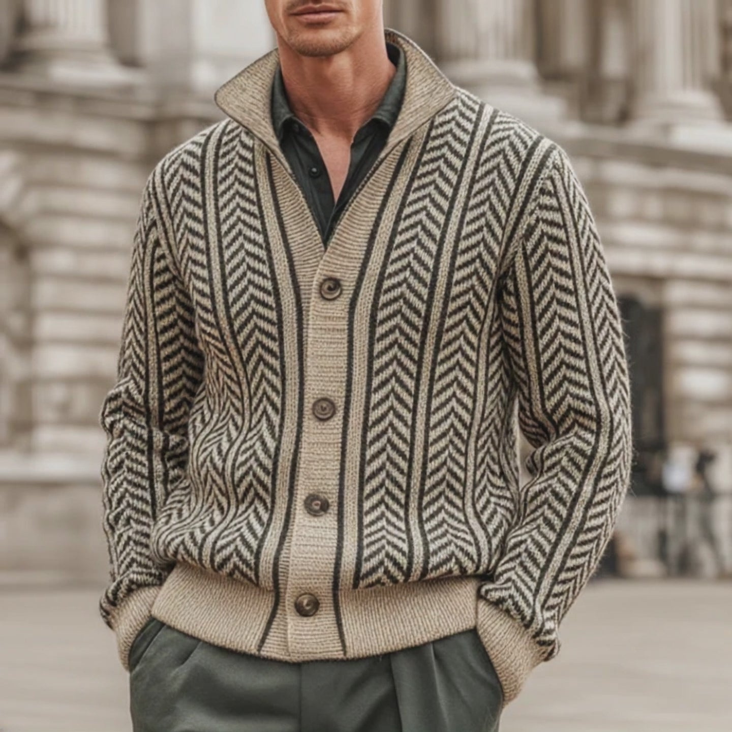 Men's Vintage Herringbone Jacquard Stand Collar Button Knit Cardigan MTA2194J0U