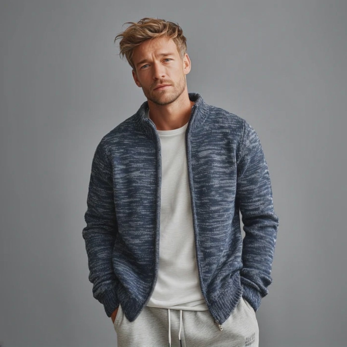 Men's Classic Casual Heterogeneous Textured Stand Collar Zippered Knit Cardigan MTA2183J0K
