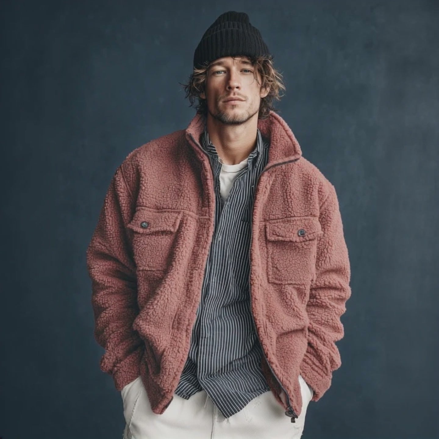 Men's Classic Casual Stand-up Collar Zipper Pink Teddy Fleece Jacket MTA2047J9K