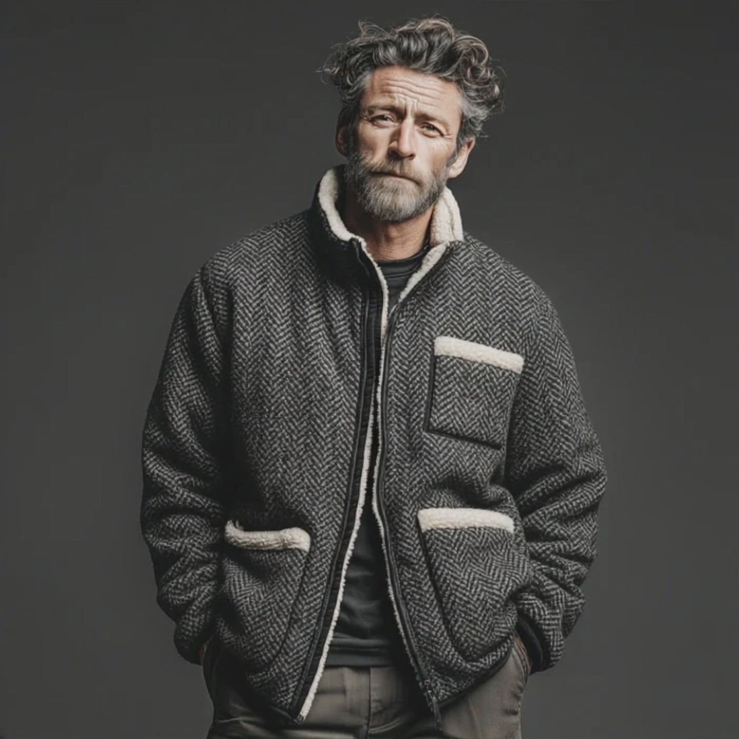 Men's Classic Casual Lapel Zipper Houndstooth Faux Sherpa Jacket MTA2063J0K