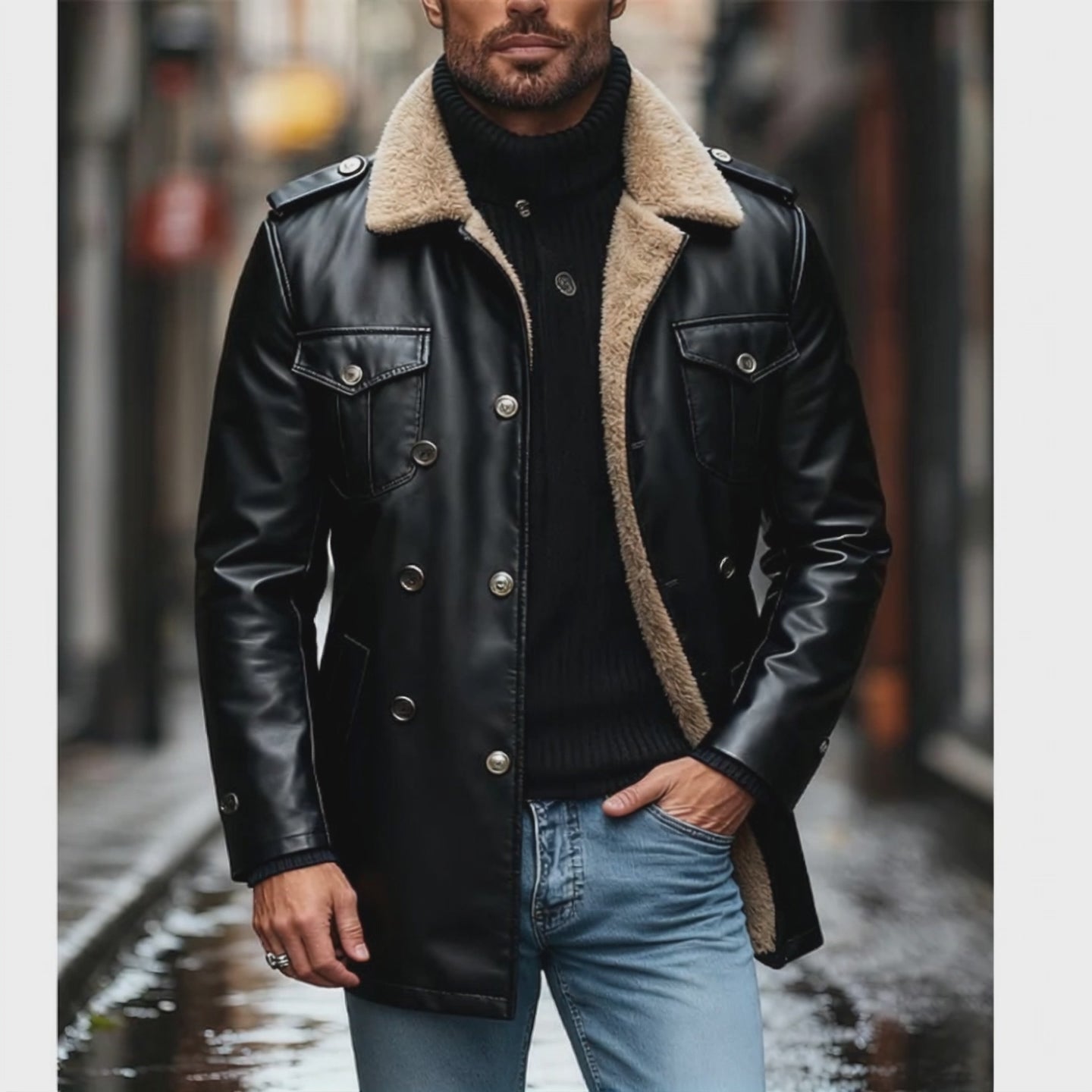 Men's Lapel Polar Fleece Lining Multi-pocket Mid-length PU Coat MTA1707J5X
