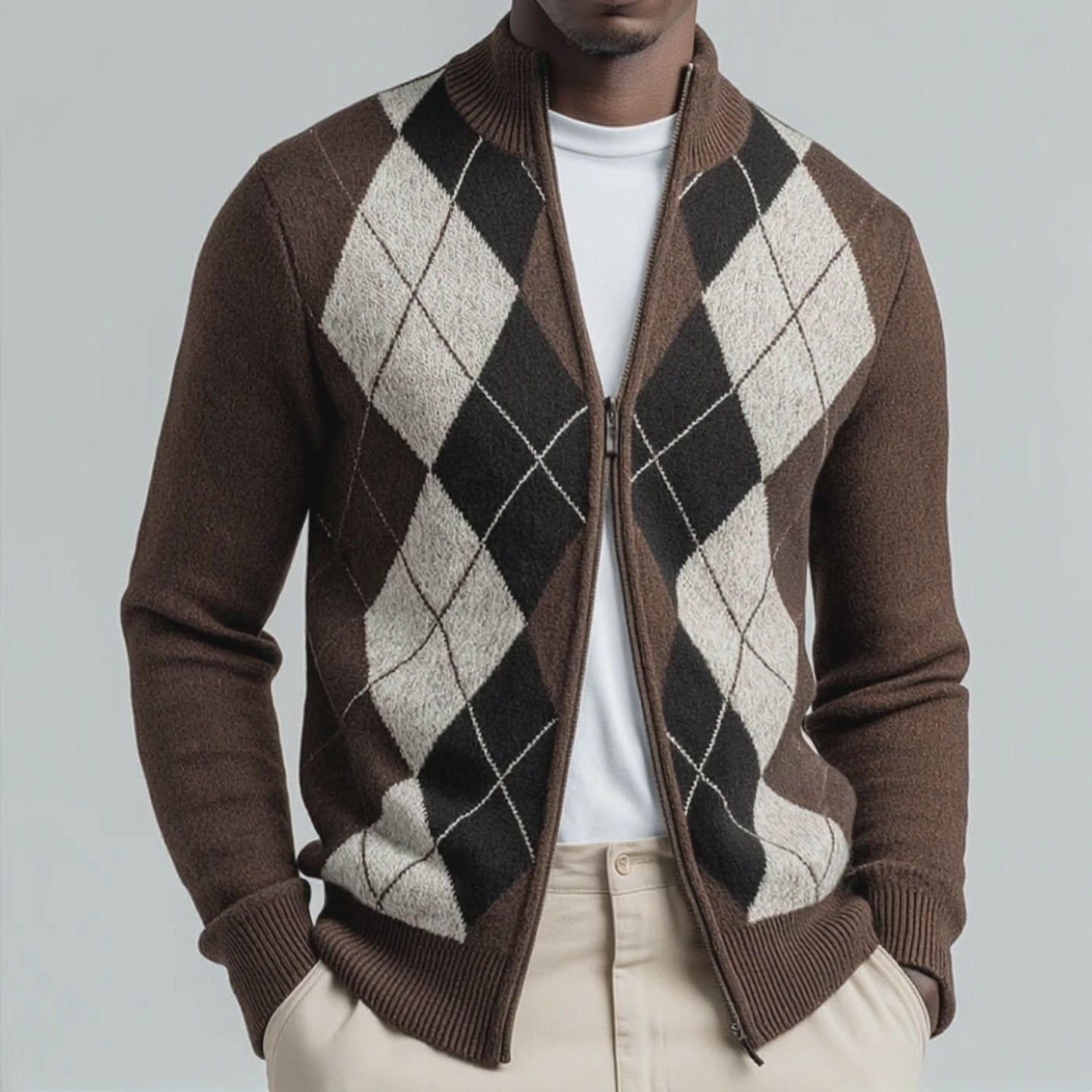 Men's Retro Casual Diamond Colorblock Double Zipper Stand Collar Sweater MTA1093J2TO