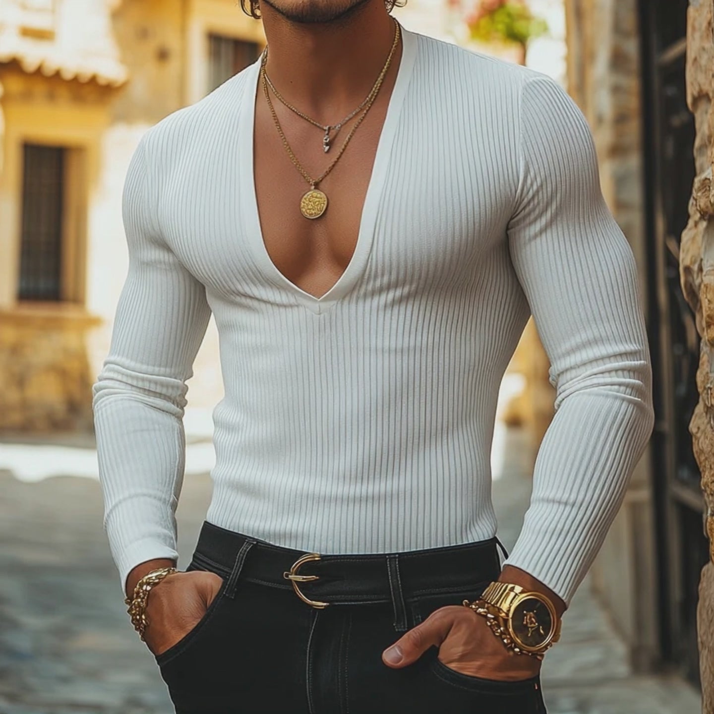 Men's Retro Casual Striped V-Neck Long-Sleeve T-Shirt MTA3011L5TO