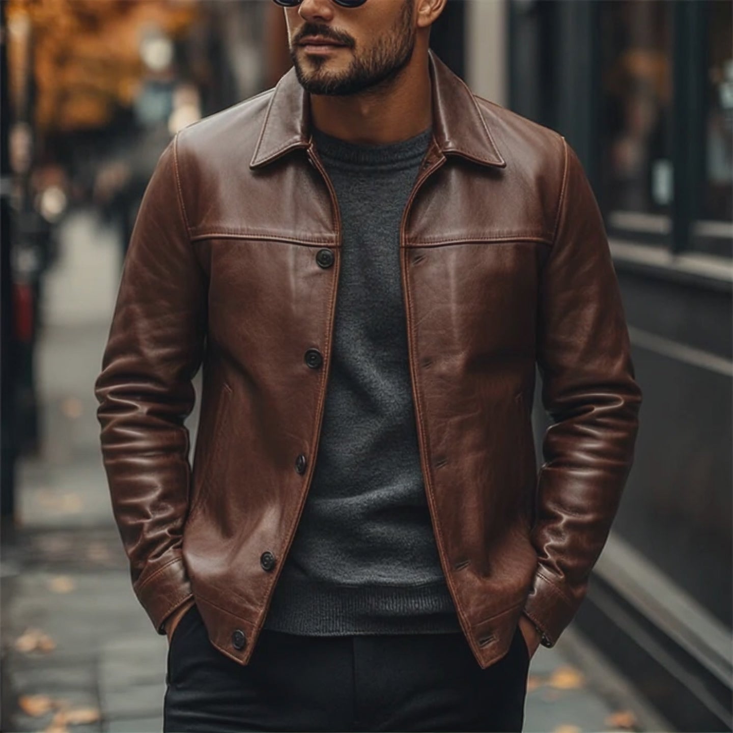 Men's Solid Color Retro Lapel Button PU Jacket MTA0431L2X