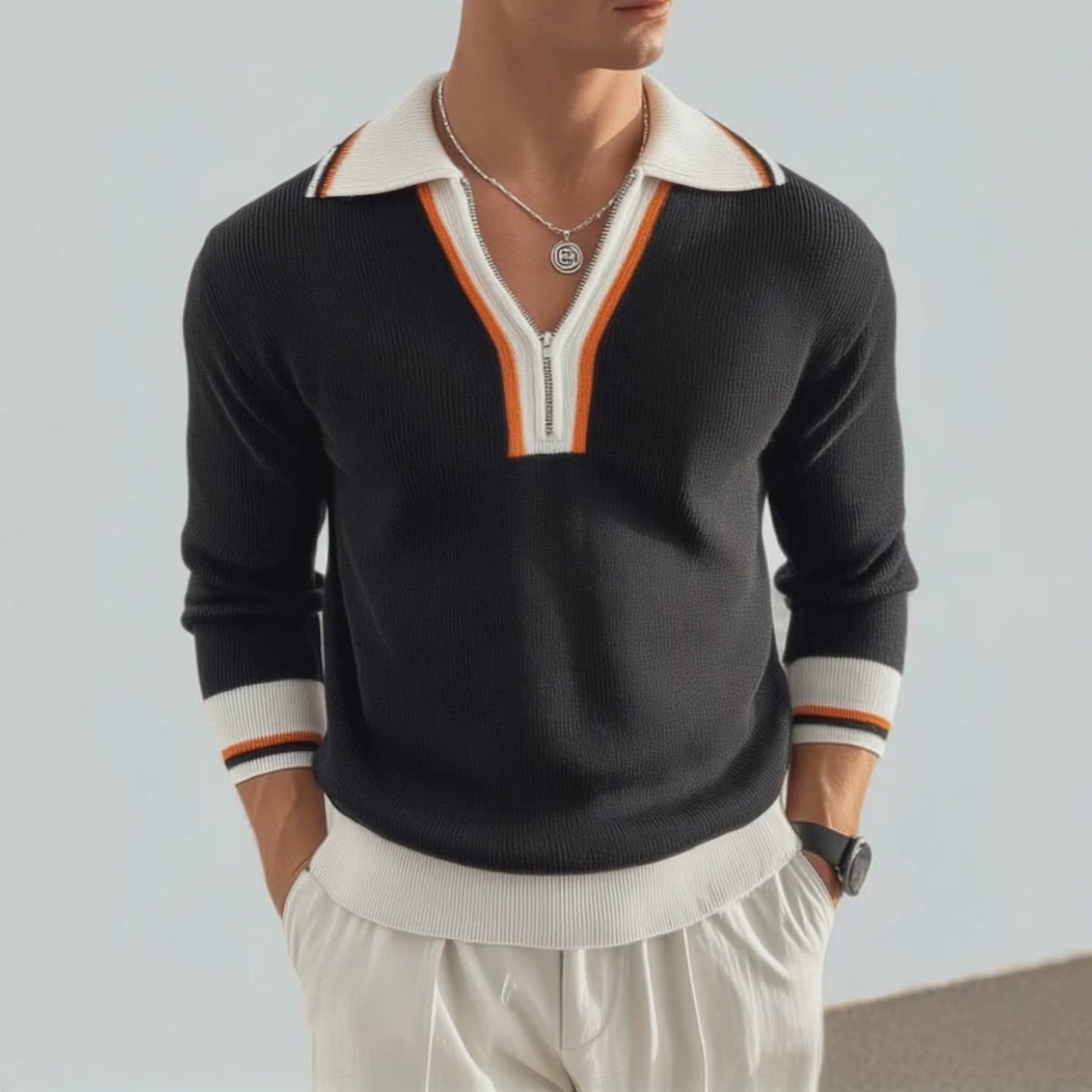 Men's Casual Contrast Color Zipper Lapel Slim Fit Knitted Long Sleeve Polo Shirt MTA3105G3M