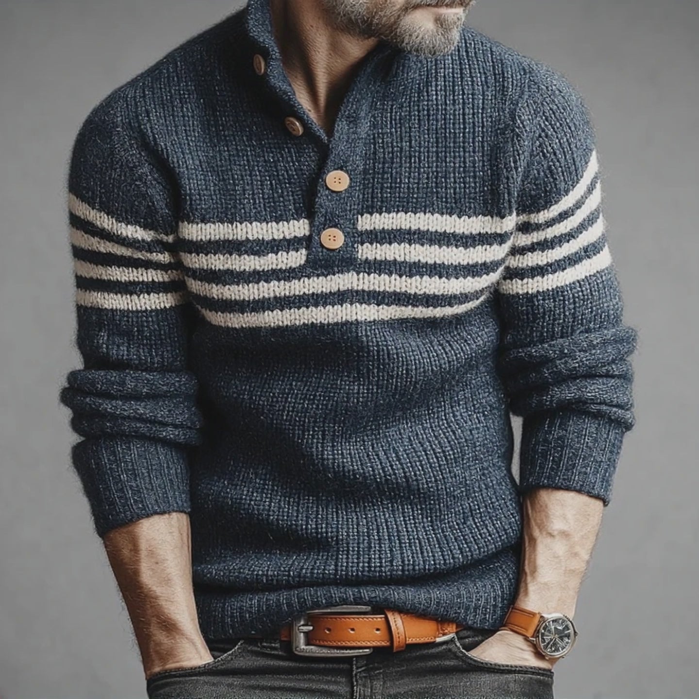 Men's Retro Casual Striped Knitted Button Stand Collar Pullover Sweater MTA1745J4TO
