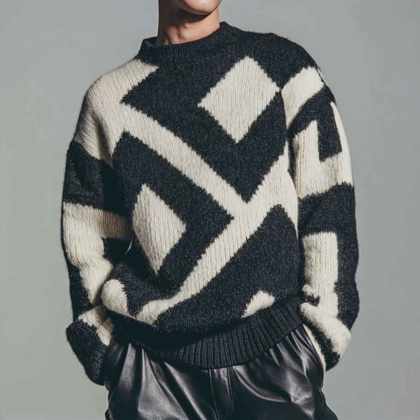 Men's Retro Knitted Crew Neck PU Pullover Sweater MTA2289J4X