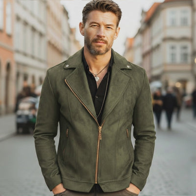 The Men's Classic Army Green Faux Suede Zip-up Jacket is a versatile piece of outerwear that combines timeless style with modern functionality. Crafted from high-quality faux suede, this jacket offers a luxurious feel with an eco-conscious mindset. The deep army green color adds a rugged yet refined touch, making it an ideal choice for both casual and semi-formal occasions.
