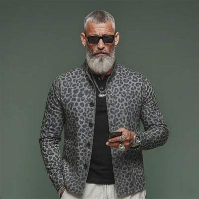 The Men’s Classic Vintage Stand-collar Leopard Print Jacquard Denim Jacket fuses heritage denim texture with a bold leopard jacquard motif to create a standout outer layer. Designed for casual to smart-casual wear, this jacket delivers a streamlined silhouette with distinctive patchwork-inspired jacquard details. Its versatile construction makes it suitable for layered looks across transitional seasons.