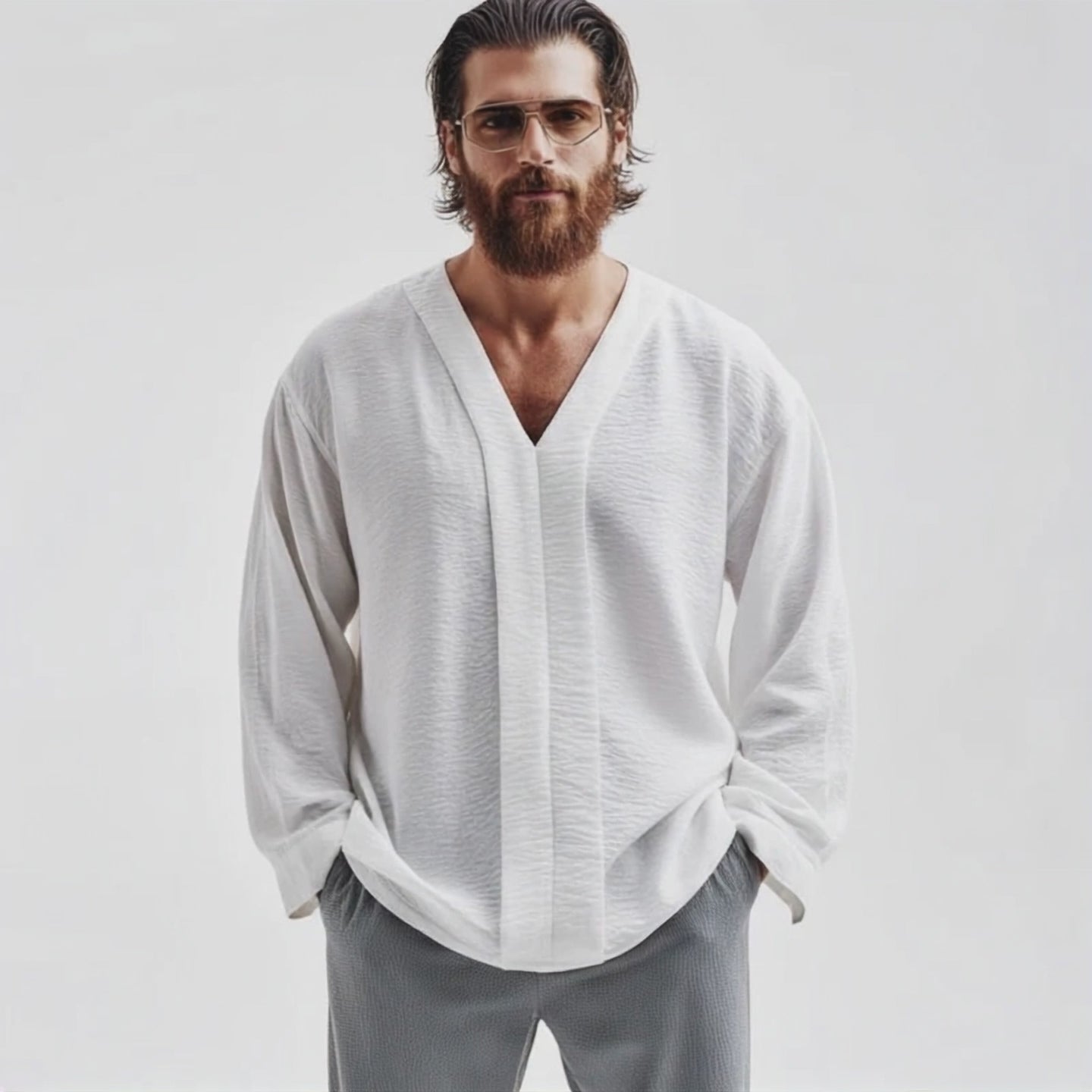 This modern long-sleeve tee combines a subtly textured, slightly sheer knit with a clean V-neck for a contemporary, breathable look. Lightweight and soft to the touch, it delivers effortless everyday comfort while adding visual interest through its fine texture and semi-transparent finish.