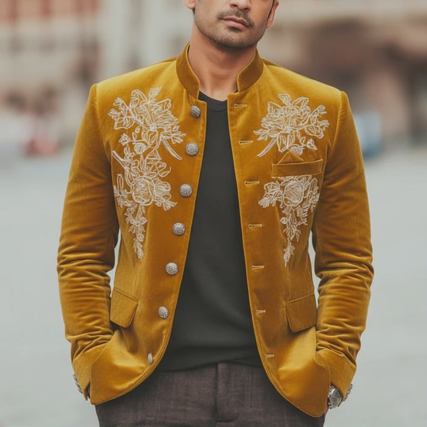This Men's Luxury Gold Yellow Velvet Embroidered Stand-collar Slim-fit Jacket is a masterpiece of elegant craftsmanship. The jacket features a rich, vibrant gold yellow velvet fabric that exudes opulence and style. Intricate embroidery adds a touch of sophistication, making it perfect for both formal and semi-formal occasions.