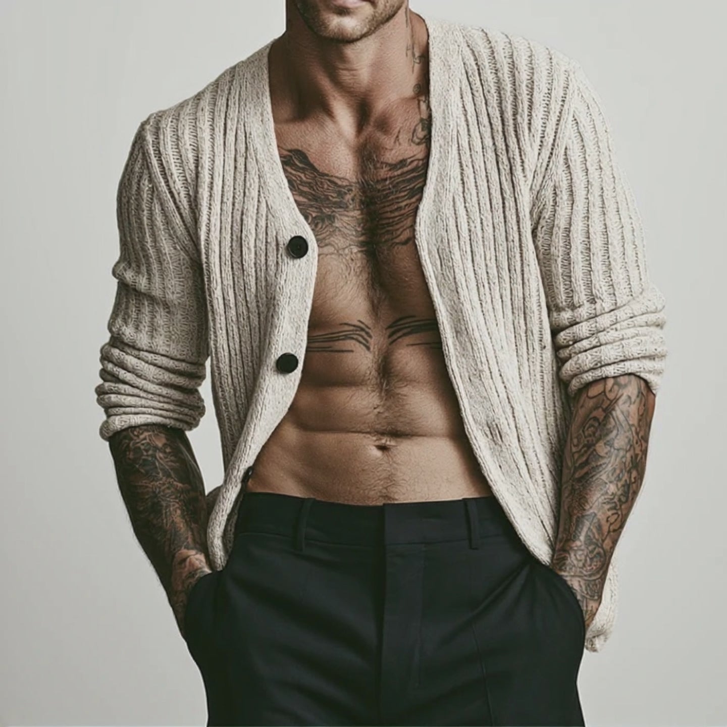 The Men's Retro Casual Knitted Collarless Button-Down Cardigan is a versatile piece of clothing that combines classic design with modern comfort. This cardigan is perfect for those seeking a blend of style and casual elegance, easily complementing a wide array of outfits.