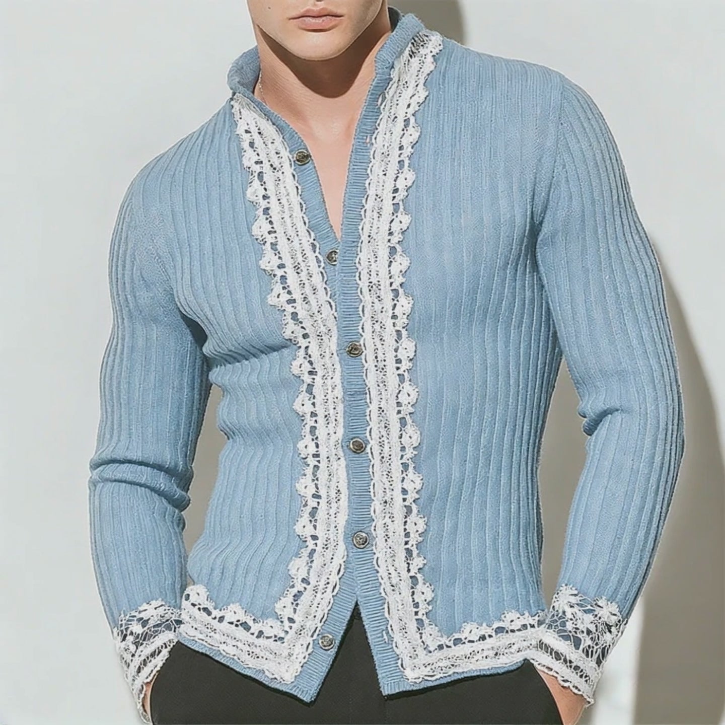 The Men's Retro Casual Knitted Patchwork Lace Stand Collar Button Cardigan is a stylish piece that seamlessly blends classic design with modern detailing. Crafted with precision, it features a stand collar that adds a touch of elegance, while the intricate patchwork lace design on the front provides a unique texture and visual appeal.