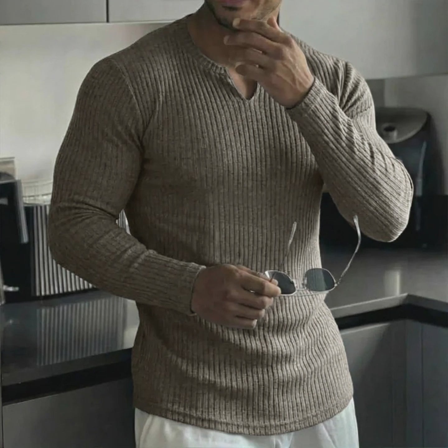The t-shirt is a versatile wardrobe staple that blends retro ribbed detailing with contemporary comfort. Its clean V-neck silhouette and solid color make it easy to style from casual to smart-casual occasions. Durable, comfortable, and effortlessly stylish—this ribbed long-sleeve tee is designed to be a go-to piece season after season.