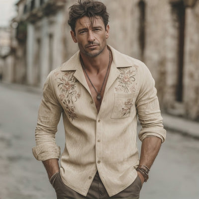 Men’s Retro Faux Suede Floral Embroidered Long-Sleeved Shirt