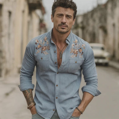 Men's Retro Light Blue Faux Suede Floral Embroidered Long-Sleeved Shirt