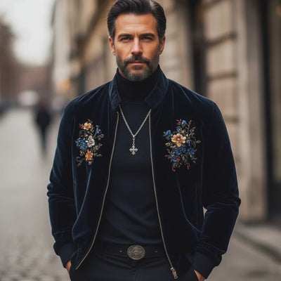 This Men's Retro Navy Blue Floral Embroidered Stand Collar Velvet Jacket exudes classic sophistication with a touch of modern artistry. Crafted from luxurious velvet, the jacket features intricate floral embroidery that adds a unique and artistic flair. The stand collar brings a tailored and refined look, emphasizing the retro appeal combined with contemporary style.