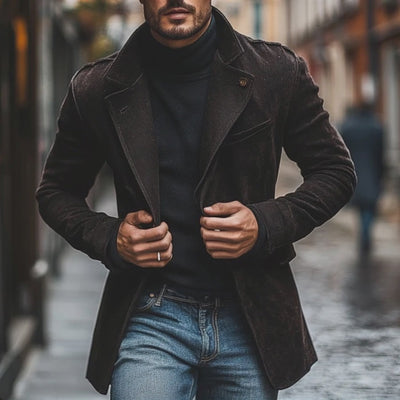 The Men's Slim-fit Lapel Faux Suede Single-breasted Mid-length Coat is crafted for the modern gentleman who appreciates both style and comfort. This mid-length coat, featuring a sleek single-breasted design, is tailored from high-quality faux suede, offering a luxurious feel and a sophisticated look without compromising on ethics.