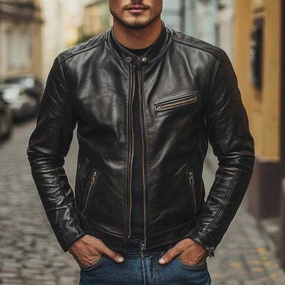 The Men's Solid Color Stand Collar Zipper PU Leather Jacket, is a stylish addition to any modern wardrobe. Made from high-quality PU leather, this jacket offers a sleek and polished look suitable for various occasions. Its design embodies a timeless appeal with a contemporary twist, featuring a stand collar and a functional zipper closure.