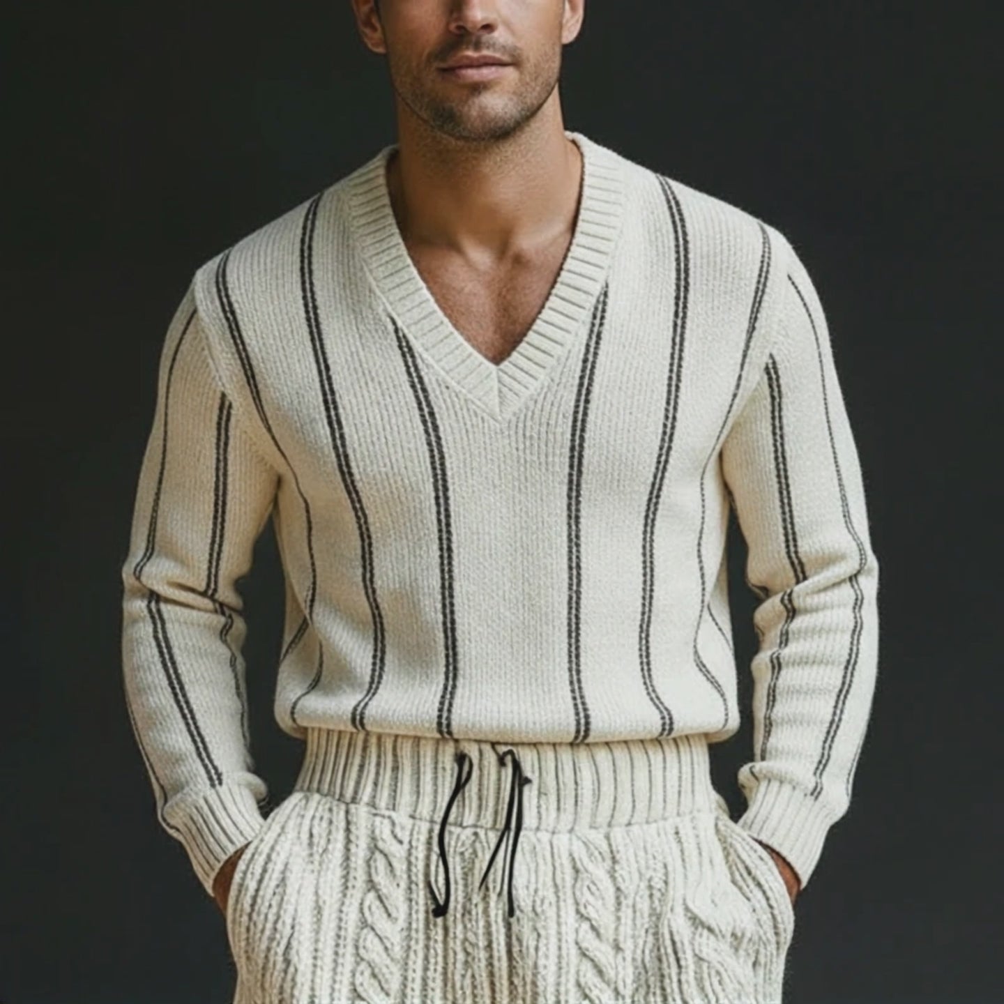 The Men's Spring Fashion Vertical Striped Cotton Yarn Knitted Long-Sleeve Sweater is crafted from high-quality cotton yarn, offering comfort and breathability. The vertical stripes add a modern touch, making it suitable for both casual and smart-casual occasions. Its knitted design ensures warmth during the cooler spring days, while the long sleeves provide additional coverage.