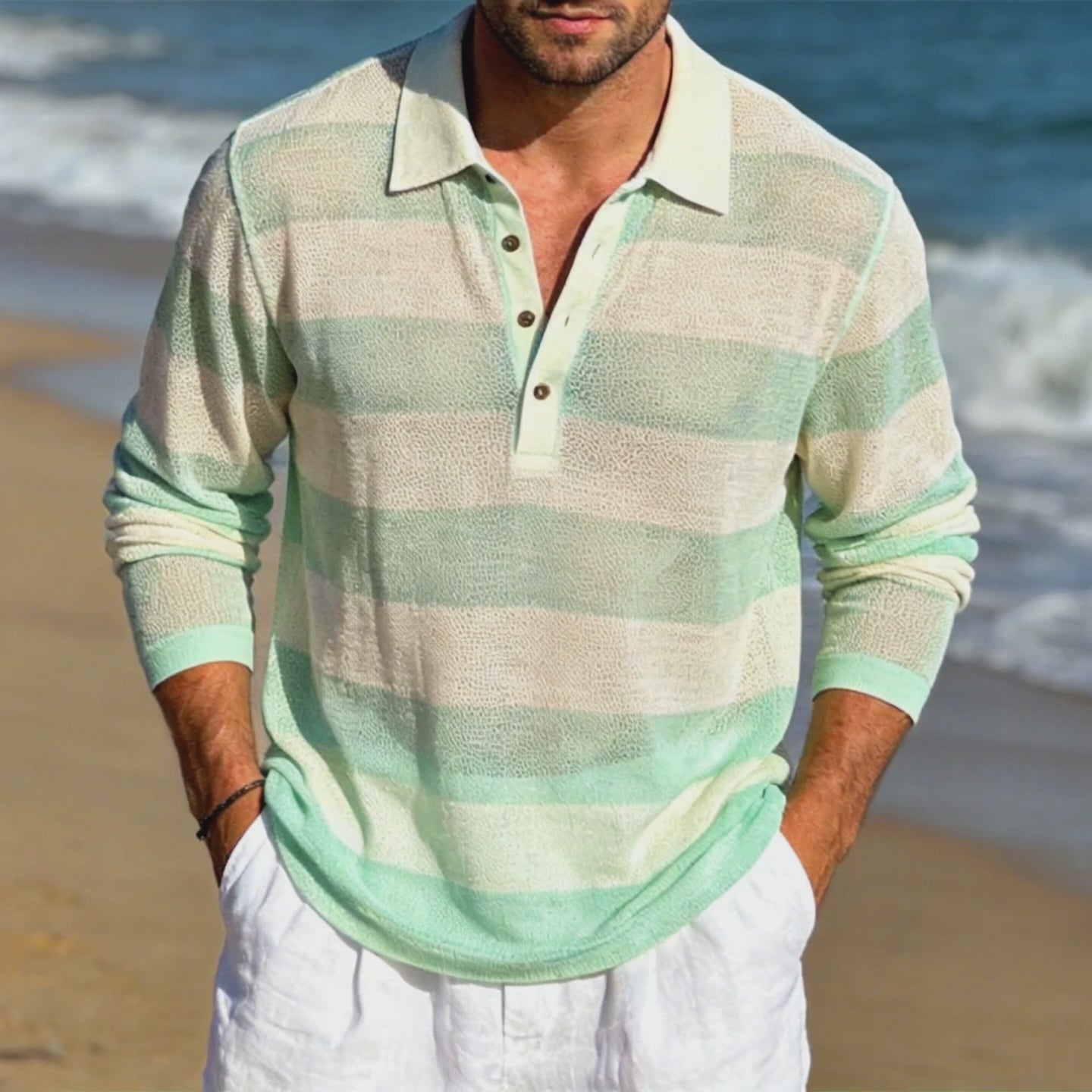 This striped cotton-yarn knit long-sleeve polo blends classic menswear details with comfortable knit softness—making it a versatile staple for spring and summer wardrobes. Its breathable fabric, timeless stripe pattern, and adaptable styling make it easy to dress up or down for everyday wear. A reliable choice for anyone seeking casual elegance and season-appropriate comfort.