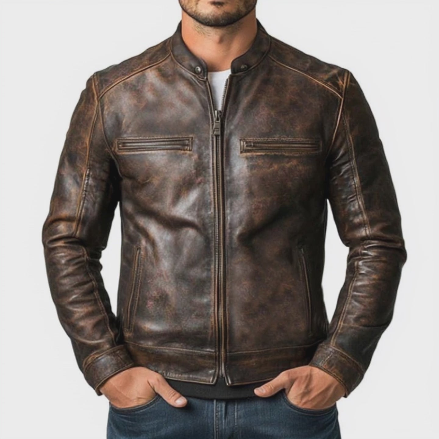 Abraza el estilo atemporal y la calidad inigualable con nuestra chaqueta de cuero vintage con cremallera desgastada para hombre. ¡Perfecto para aquellos que aprecian la moda clásica con un toque moderno!
