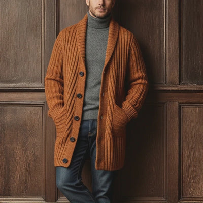 The Men's Winter Fashion Shawl Collar Ribbed Cotton Yarn Knitted Mid-length Cardigan is a harmonious blend of elegance and practicality, perfect for the cold winter months. Its shawl collar and ribbed design bring a touch of sophistication while ensuring warmth and comfort.