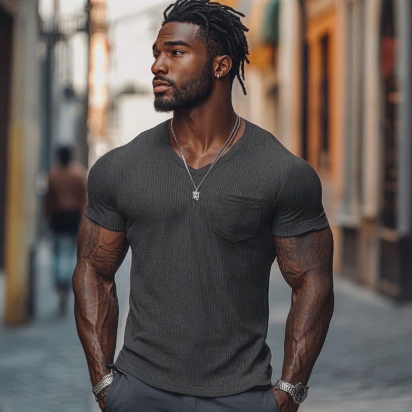 Men's Casual Ribbed Cotton Blend V-neck Slim Fit Short-sleeved T-shirt 51265184M