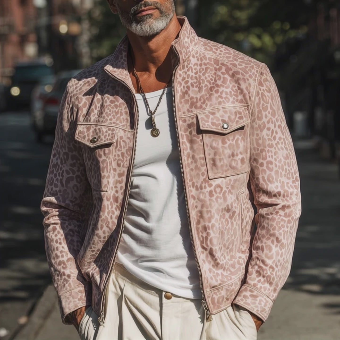 Men's Fashion Vintage Leopard Velvet Notch Lapel Double Breasted Slim Knee-Length Coat MTA0773H4M